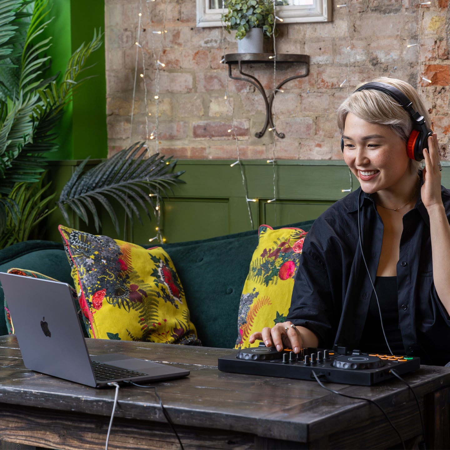 Connect your PC/Mac to the DDJ-FLX2 via the USB Type-C cable. Play your mix loudly through the speaker(s) connected via an audio cable.