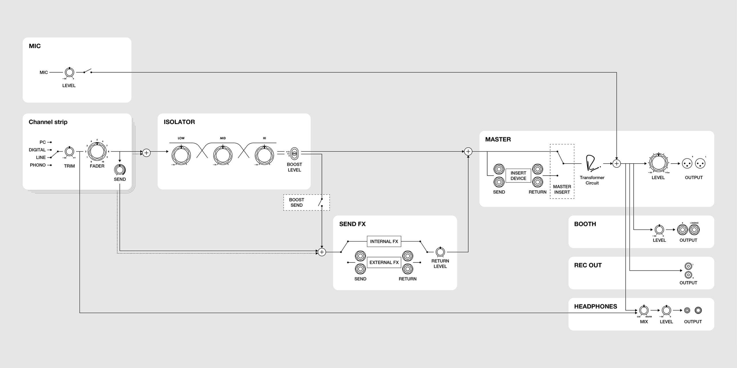 Add one of the built-in Send Effects, or an effect from an external unit, to the sound of any of the master isolator frequency bands. Press the Boost Send button for the low, mid, or high and, as you turn the isolator knob, the effect will be applied to that band. This enables you to apply effects with a single hand in a way that previously needed two, leaving the other hand free for mixing another track.
