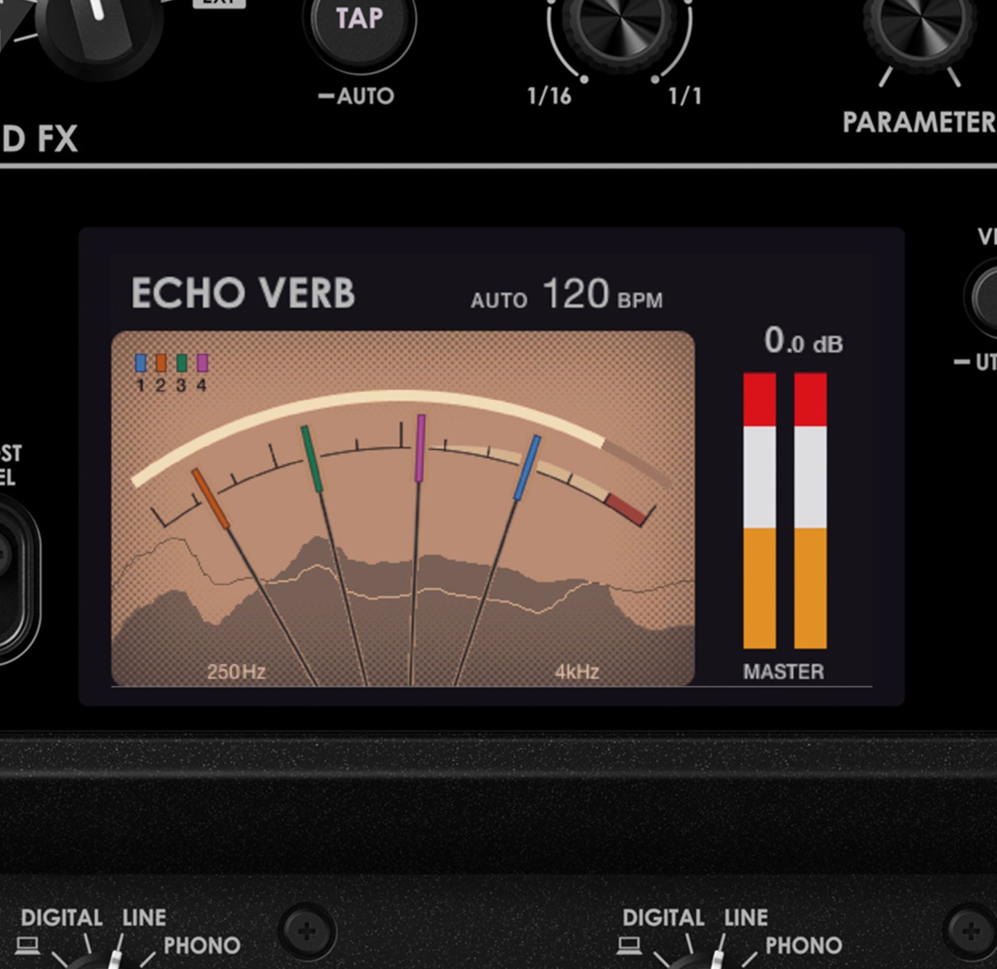 The euphonia features 5 built-in spatial effects and a high-pass filter, so you can easily add depth and breadth to your music. These are: Delay, Tape Echo, Echo Verb, Reverb, Shimmer, and HPF (high-pass filter). Also Send/Return section which you the option to connect external effects units. A dedicated knob on each channel enables you to adjust the send level going to the selected effect, so you can apply just the right amount. And the time knob, which allows you to adjust the effect delay and reverb time, has a proprietary mechanism developed specifically for this unit that automatically switches between a clicking sensation and no-clicking sensation depending on the effect you’ve selected. When using Delay, Tape Echo, and Echo Verb, the knob clicks according to the BPM, so you can quickly apply effects. When you use Reverb and Shimmer, there’s no clicking so you can turn the knob freely to perform smooth sweeps or make tiny adjustments to find the perfect setting.